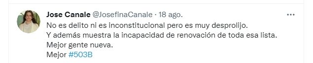 "Además muestra la incapacidad de renovación de toda esa lista", disparó Josefina Canale en su cuenta de Twitter. La legisladora provincial es cabeza de lista como candidata a diputada nacional en CambiaYa, la lista que compite en el oficialismo contra la boleta que lleva a Alfredo Cornejo como candidato a senador nacional y Julio Cobos como candidato a diputado.