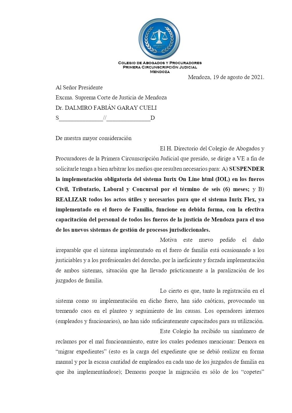 Integrantes del Directorio del Colegio de Abogados de la Primera Circunscripción de la provincia de Mendoza le solicitaron al presidente de la Suprema Corte de Justicia, Dalmiro Garay, que suspenda por los próximos seis meses la implementación del sistema Iurix en los fueros Civil, Tributario, Laboral y Concursal.
