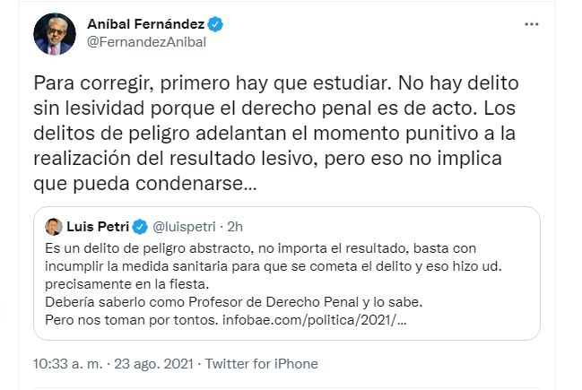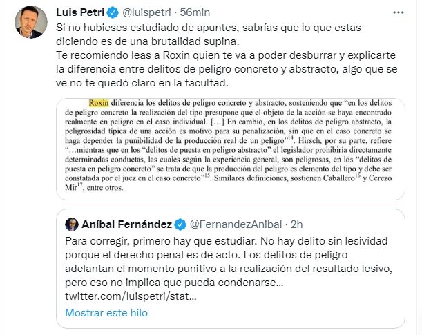 Pero la pelea no terminó ahí. Petri redobló la apuesta y acusó a Aníbal Fernández de "estudiar de apuntes". "Si no hubieses estudiado de apuntes, sabrías que lo que estas diciendo es de una brutalidad supina. Te recomiendo leas a Roxin quien te va a poder desburrar y explicarte la diferencia entre delitos de peligro concreto y abstracto, algo que se ve no te quedó claro en la facultad", finaliza con una cita sobre la diferencia entre los delitos de peligro concreto y abstracto.