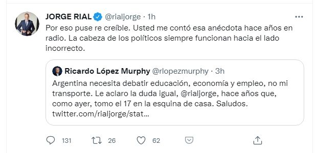 En medio de la campaña electoral se viralizó una imagen del precandidato a diputado nacional Ricardo López Murphy viajando en colectivo. La foto no pasó desapercibida y un comentario del periodista Jorge Rial desató una polémica en Twitter. "Re creíble", escribió Rial.