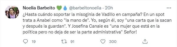 Frente a esos dicho, Noelia Barbeito usó Twitter para hacer público el descargo: "¿Hasta cuándo soportar la misoginia de Vadillo en campaña? En un spot trata a Anabel como "la mano de". Yo, según él, soy "una carta que la sacan y después la guardan". Y Josefina Canale es "una mujer que está en la política pero no deja de ser la parte administrativa" Señor!"