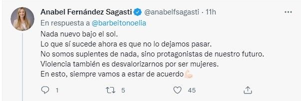 Por supuesto los mensajes de apoyo hacia Barbeito no se demoraron en aparecer e incluso la senadora nacional Anabel Fernández Sagasti apoyó la denuncia de la referente de la izquierda. "Nada nuevo bajo el sol. Lo que sí sucede ahora es que no lo dejamos pasar. No somos suplentes de nada, sino protagonistas de nuestro futuro. Violencia también es desvalorizarnos por ser mujeres. En esto, siempre vamos a estar de acuerdo", describió la legisladora.