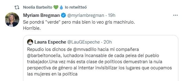 Myriam Bregman, diputada porteña por el Partido de los Trabajadores Socialistas, brindó a través de Twitter su solidaridad para la activista del FIT en Mendoza. "Basta de Machista", fue uno de los comentarios usados.