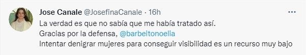 Josefina Canale, otra de la mujeres mencionadas por Mario Vadillo, también criticó el accionar del referente del Partido Verde. "La verdad es que no sabía que me había tratado así. Gracias por la defensa, @barbeitonoelia. Intentar denigrar mujeres para conseguir visibilidad es un recurso muy bajo", acusó. Canale es precandidata a diputada nacional del frente Cambia YA.