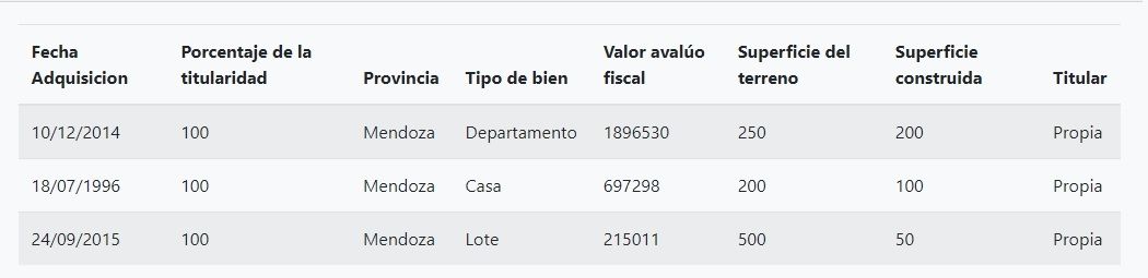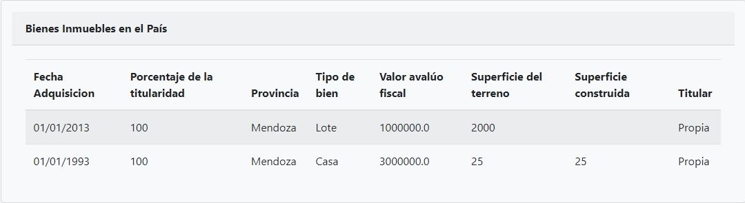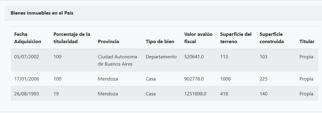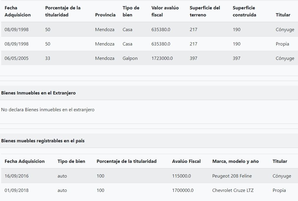 - Patricia Edith Irrutia, Secretaria General de la Asociación de Trabajadores de la Sanidad, su última presentación se realizó en octubre del 2019. En su DDJJ presentó dos inmuebles en la provincia de Mendoza.