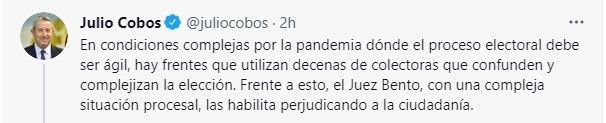 El senador provincial Marcelo Rubio describió en las redes sociales que "el juez Bento habilita las colectoras beneficiando una vez más al PJ sin pensar en el gasto innecesario que eso produce en un momento de enorme crisis económica y donde el electorado necesita reglas claras".