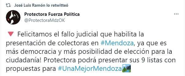Un sector importante de la política salió a "bancar" la decisión del juez, tal es el caso de el diputado José Luis Ramón, presidente del espacio Protectora Fuerza Política que presentará 9 listas en las próximas elecciones y por tal motivo felicitan a Bento por la resolución.