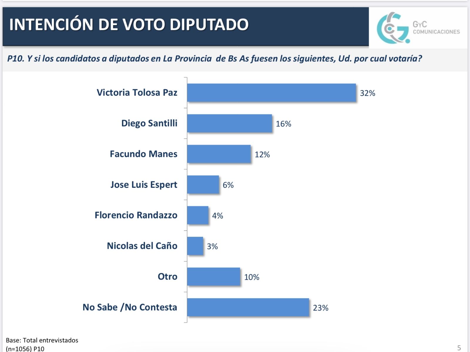Según la medición realizada por la consultora GyC Comunicaciones, la boleta de diputados del oficialismo, encabezada por la funcionaria albertista Victoria Tolosa Paz, seguida del exministro de Salud bonaerense, Daniel Gollan, muestra una intención de voto del 32%. En tanto que las dos listas de Juntos suman 28%. Una diferencia que, si se consolida, sería sustancialmente menor a la obtenida en 2019 por Alberto Fernández contra Mauricio Macri.
