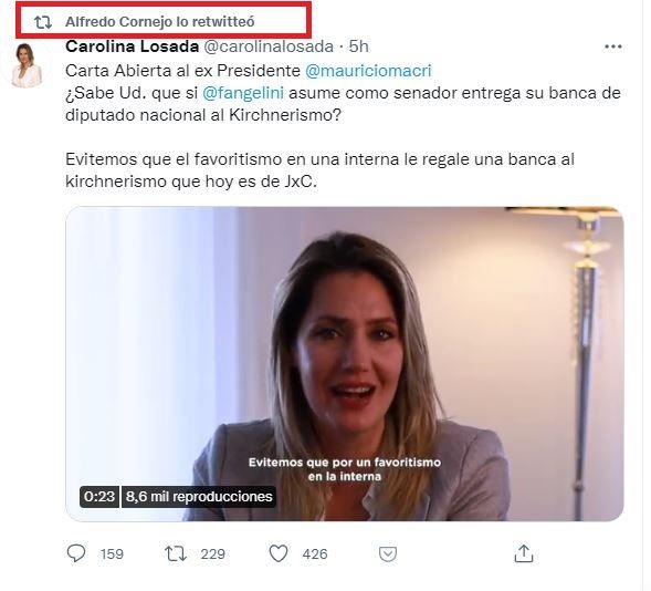 "Carta Abierta al ex Presidente @mauriciomacri. ¿Sabe Ud. que si @fangelini (Federico Angelini) asume como senador entrega su banca de diputado nacional al Kirchnerismo? Evitemos que el favoritismo en una interna le regale una banca al kirchnerismo que hoy es de JxC", expresa el comentario de Losada que fue compartido por el ex gobernador de Mendoza.