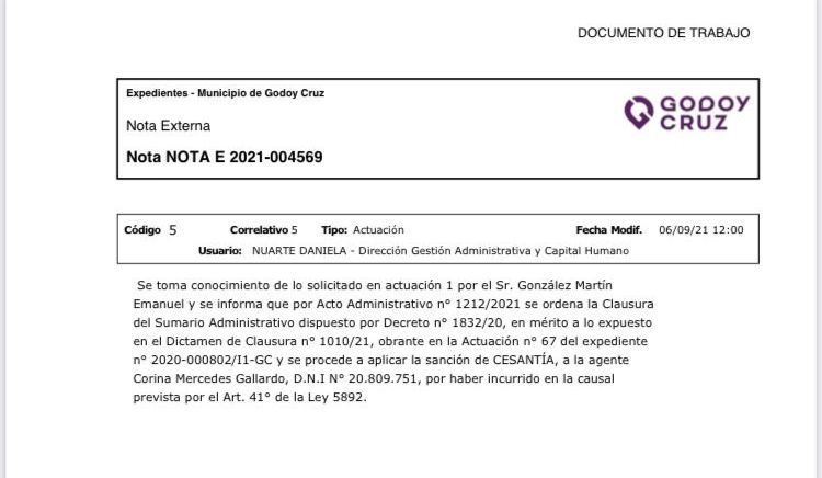 Lo cierto es que según consta en la respuesta a un pedido de información pública presentado por González, Gallardo finalmente fue desvinculada de la planta municipal. "Procede a aplicar la sanción de cesantía a la agente Corina Mercedes Gallardo por haber incurrido en la causal prevista en el artículo 41 de la ley 5892", expresa.