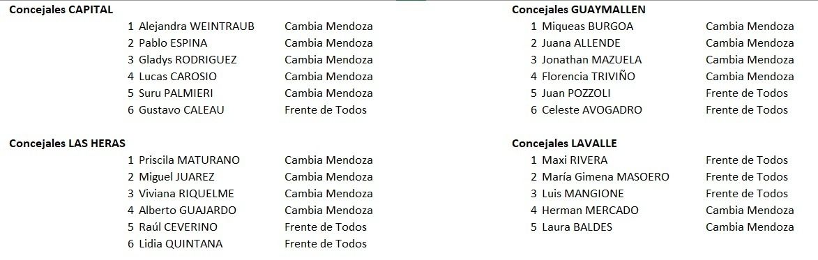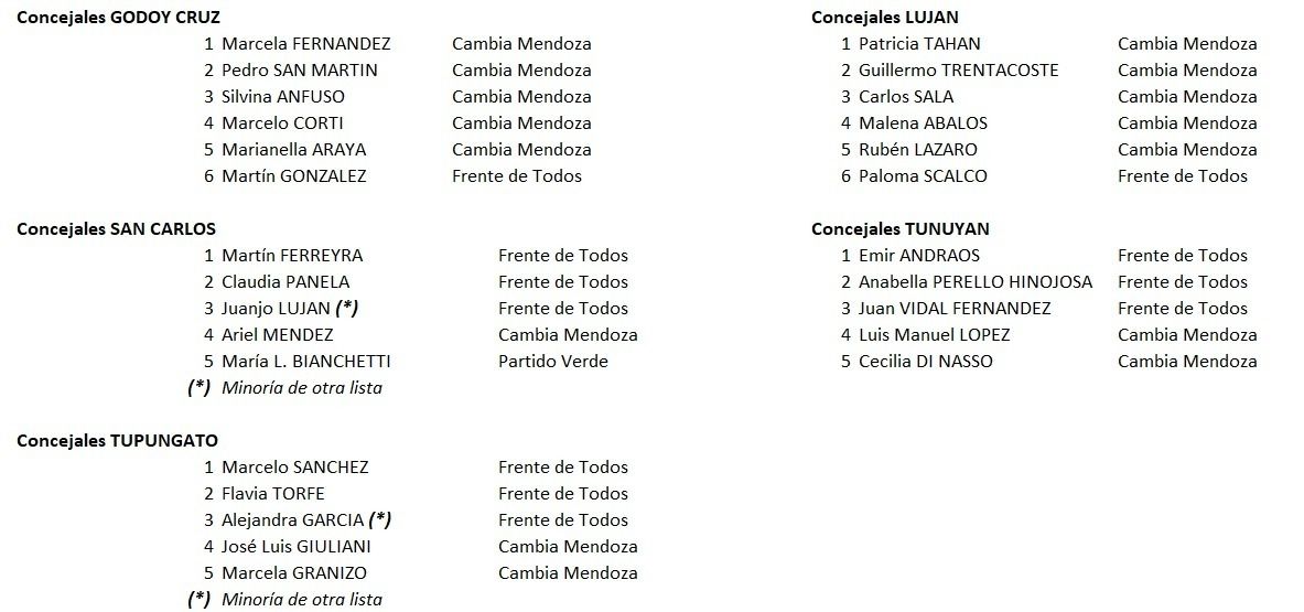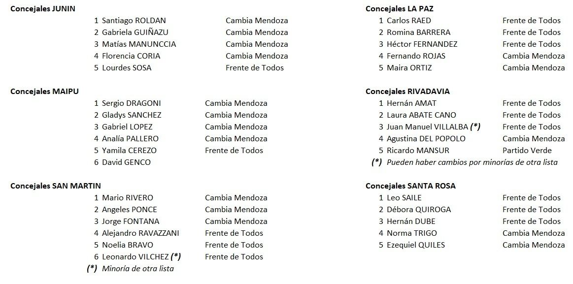 En cada uno de los departamentos quedaría conformado en la mayoría por concejales Cambia Mendoza, la minoría la obtiene el Frente de Todos y la novedad se daría en los municipios de Rivadavia y San Carlos.