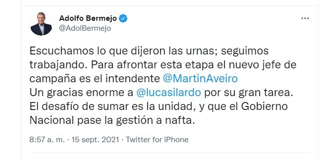"El desafío de sumar es la unidad, y que el Gobierno nacional pase la gestión a nafta", disparó el candidato a diputado nacional Adolfo Bermejo en sus redes sociales luego de agradecerle a Lucas Ilardo por la tarea realizada y anunciar que Martín Aveiro es el nuevo jefe de campaña.