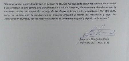 "Como resumen, puede decirse que en general la obra no fue realizada según las normas del arte del buen construir, lo que generó que la misma sea inestable e insegura; sin mencionar el hecho de que la empresa constructora nunca hizo entrega de los planos de la obra a los propietarios. Por otro lado, luego de desmantelar la construcción la empresa procedió a retirar lo materiales y dejar los escombros en el predio, con los respectivos daños en la vivienda original y el patio de la misma", describe el informe del profesional de la construcción.