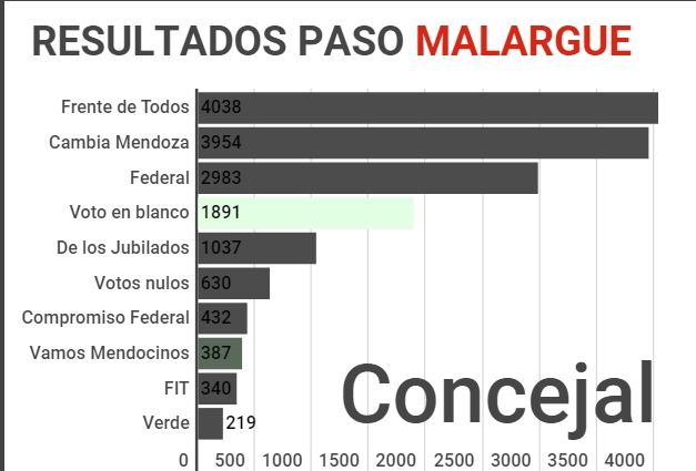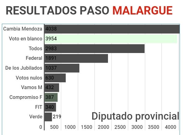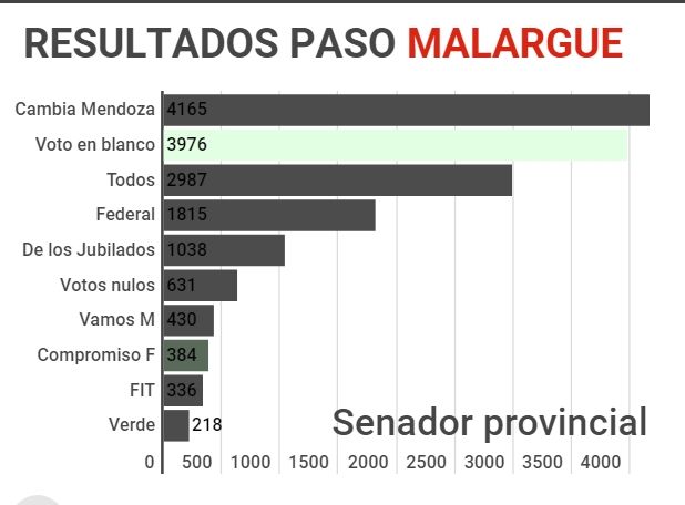 En las PASO domingo último el voto en blanco fue la tercera opción más elegida en Mendoza, al punto que la provincia lidera el ranking nacional del voto en blanco. Y tras la difusión del recuento provisional de las elecciones PASO 2021 se confirma que esa opción arrasó en el departamento de Malargüe ya que fue lo más votado para diputado y senador nacional, y casi logró lo mismo en diputado y senador provincial, no así en el voto para elegir concejales, en el que - tras superar los 4.800 votos- bajó a 1984 votos.