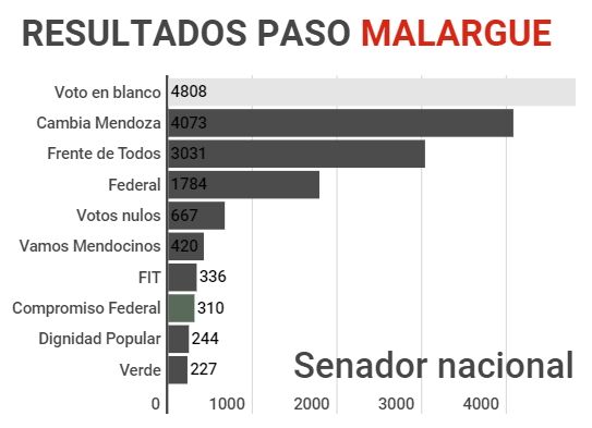 En la categoría senadores nacionales las listas de Cambia Mendoza sumaron el 26,7% de los votos y la del Frente de Todos llegó a 19,9%, mientras que el voto en blanco superó el 30%. En diputados nacionales ocurrió lo mismo. Es decir, la mayoría de los malargüinos prefirieron no votar legisladores nacionales antes que poner en el sobre a Alfredo Cornejo, Rodolfo Suarez, Julio Cobos o Anabel Fernández Sagasti.