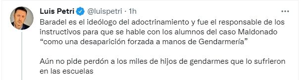 "Baradel es el ideólogo del adoctrinamiento y fue el responsable de los instructivos para que se hable con los alumnos del caso Maldonado 'como una desaparición forzada a manos de Gendarmería'. Aún no pide perdón a los miles de hijos de gendarmes que lo sufrieron en las escuelas", agregó.