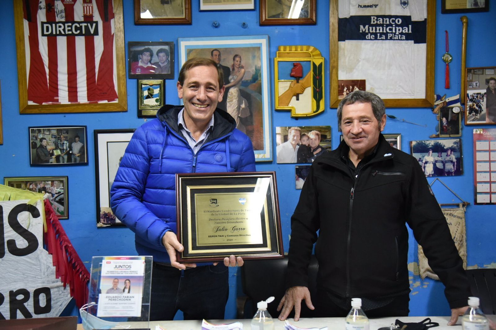 En reconocimiento a la ayuda dada durante la cuarentena el Sindicato de Choferes de Taxis de la Plata declaro “Pasajero Ilustre de la Ciudad de La Plata” al intendente Julio Garro. Quien sí recibió su plaqueta y el apoyo incondicional de los taxistas platenses en la interna.