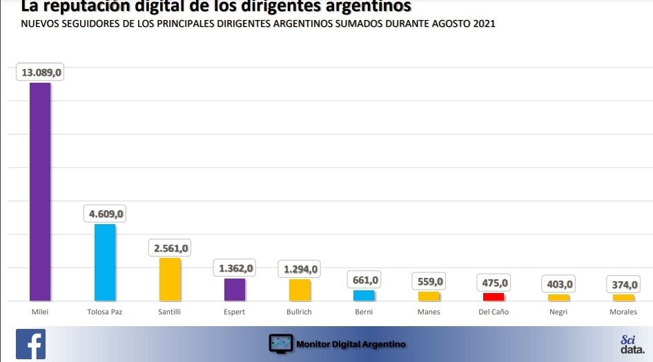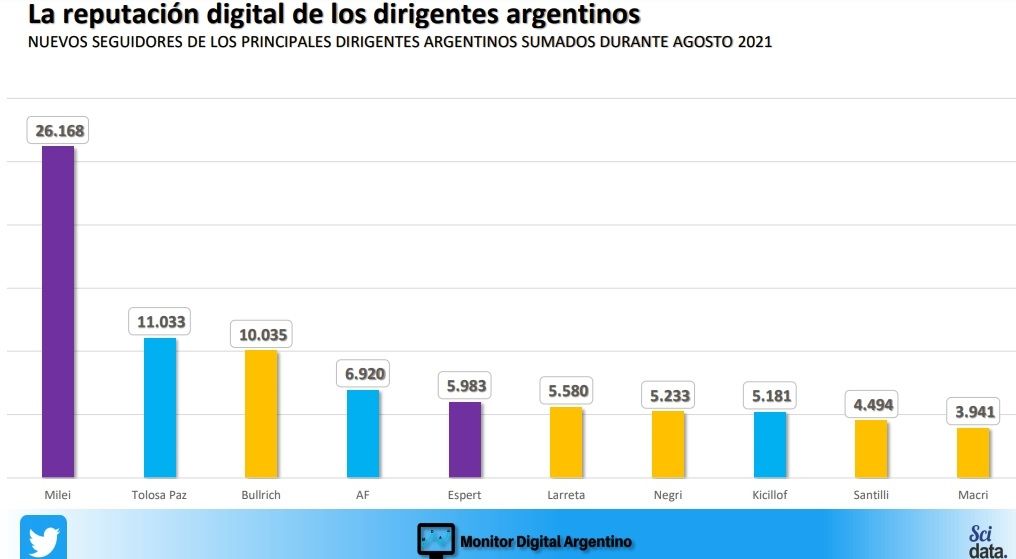 "Milei, durante el mes pasado, sumó más de 26 mil personas para superar los 455 mil seguidores al cierre de agosto y ya con 457 mil hasta el viernes 3 de septiembre. Milei sumó alrededor del 6% de nuevas personas que lo siguen en Twitter. Él tiene seguidores y suma cada vez más", describió Corbalán.