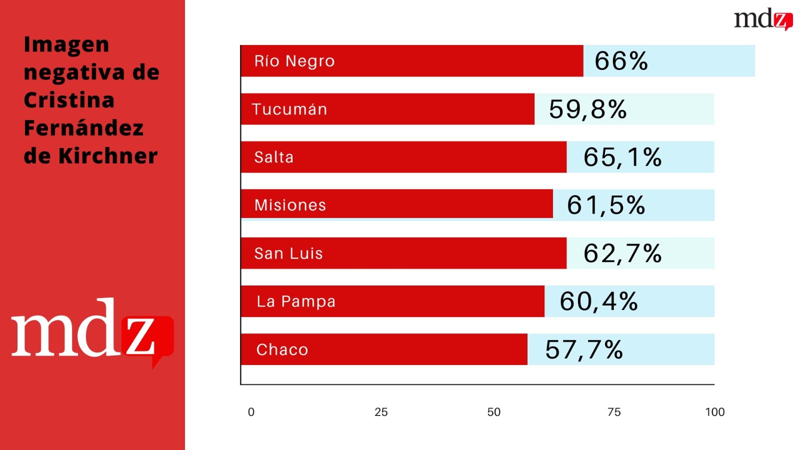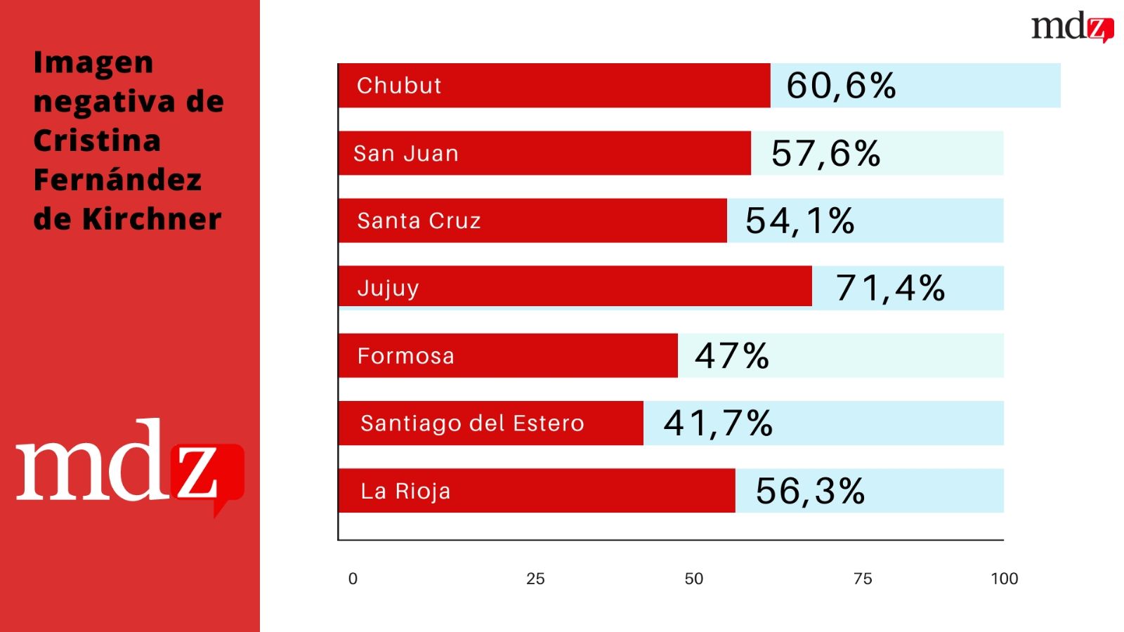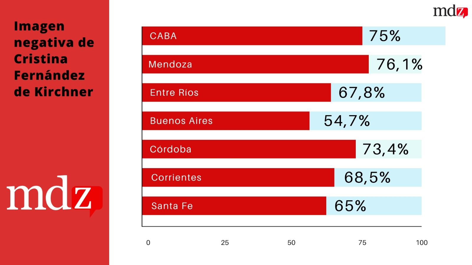Al tener en cuenta los lugares más poblados, en Mendoza, la vice tiene 76,1% de rechazo contra 69,5% del presidente; en Santa Fe, quedan 65,2% vs. 64,6%; en Buenos Aires, 54,7% vs. 51,7%; en Tucumán, 59,8% vs. 53,7% y en Entre Ríos, 67,8% vs. 63,1%.