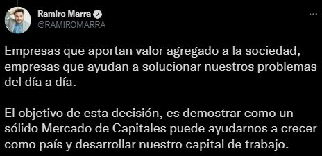 Y agregó: "Empresas que aportan valor agregado a la sociedad, empresas que ayudan a solucionar nuestros problemas del día a día. El objetivo de esta decisión es demostrar como un sólido Mercado de Capitales puede ayudarnos a crecer como país y desarrollar nuestro capital de trabajo".