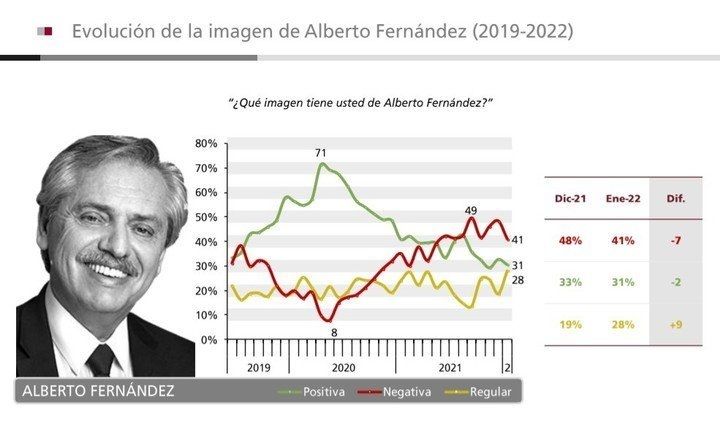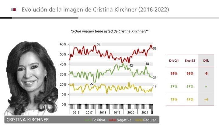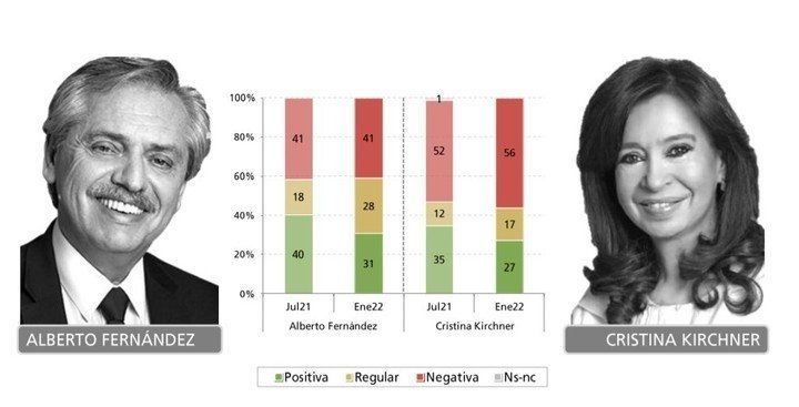 En tanto, la imagen del presidente, Alberto Fernández, mezcla 31% de positividad, 28% de regularidad y 27% de negatividad. La vice, Cristina Fernández de Kirchner, obtuvo 27%, 17% y 56%.