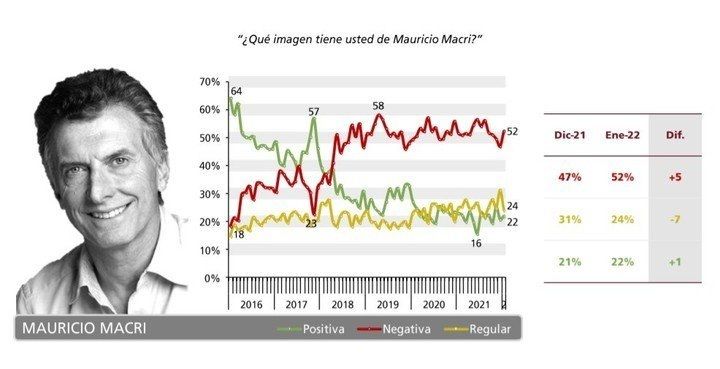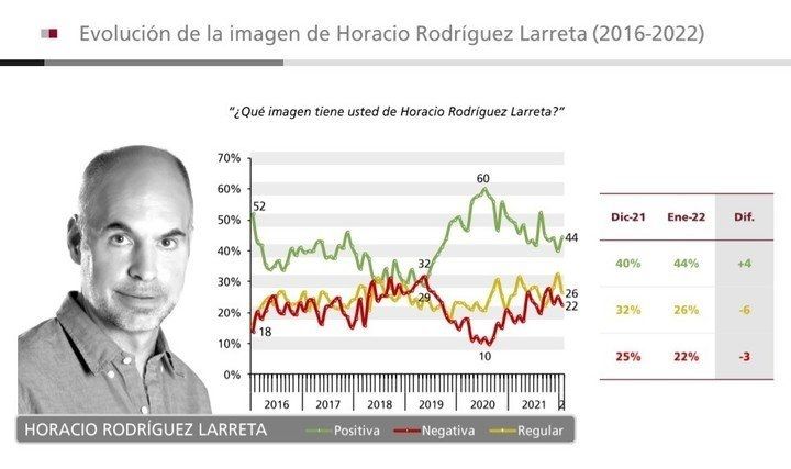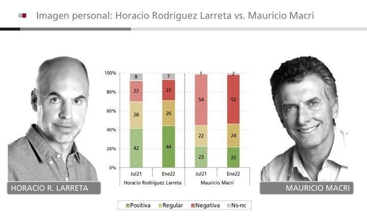 En este caso, puede notarse un ventaja de Larreta por sobre Macri. En detalle, cuenta con una combinación del 44% de imagen positiva, 26% regular y 22% negativa. Macri alcanza un 22%, 24% y 52%.