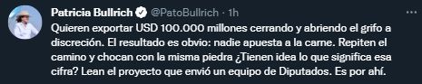 "Quieren exportar USD 100.000 millones cerrando y abriendo el grifo a discreción. El resultado es obvio: nadie apuesta a la carne. Repiten el camino y chocan con la misma piedra ¿Tienen idea lo que significa esa cifra? Lean el proyecto que envió un equipo de Diputados. Es por ahí", se quejó Bullrich.