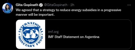 Este domingo Gopinath sumó un tuit en el que aseguró: "Acordamos que una estrategia para reducir los subsidios a la energía en una forma progresiva será importante" y adjuntó el comunicado del Fondo tras el acuerdo.