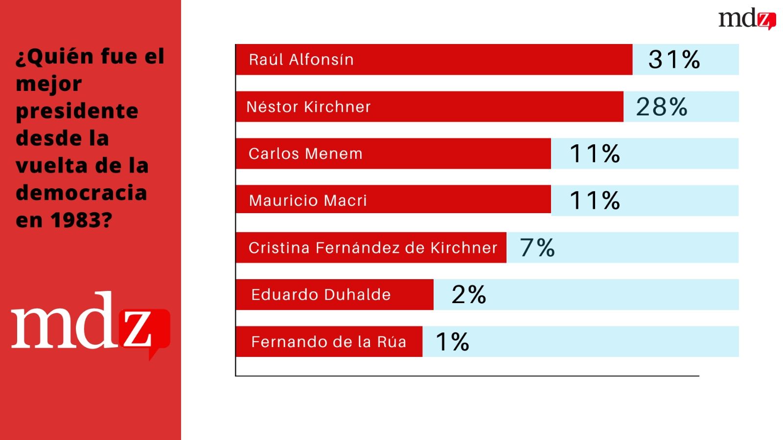 El histórico dirigente de la Unión Cívica Radical (UCR) obtuvo 31%, mientras que Kirchner alcanzó el 28%. En tanto, el tercer puesto terminó empatado entre Mauricio Macri (2015-2019) y Carlos Menem (1989-1999) con 11%.