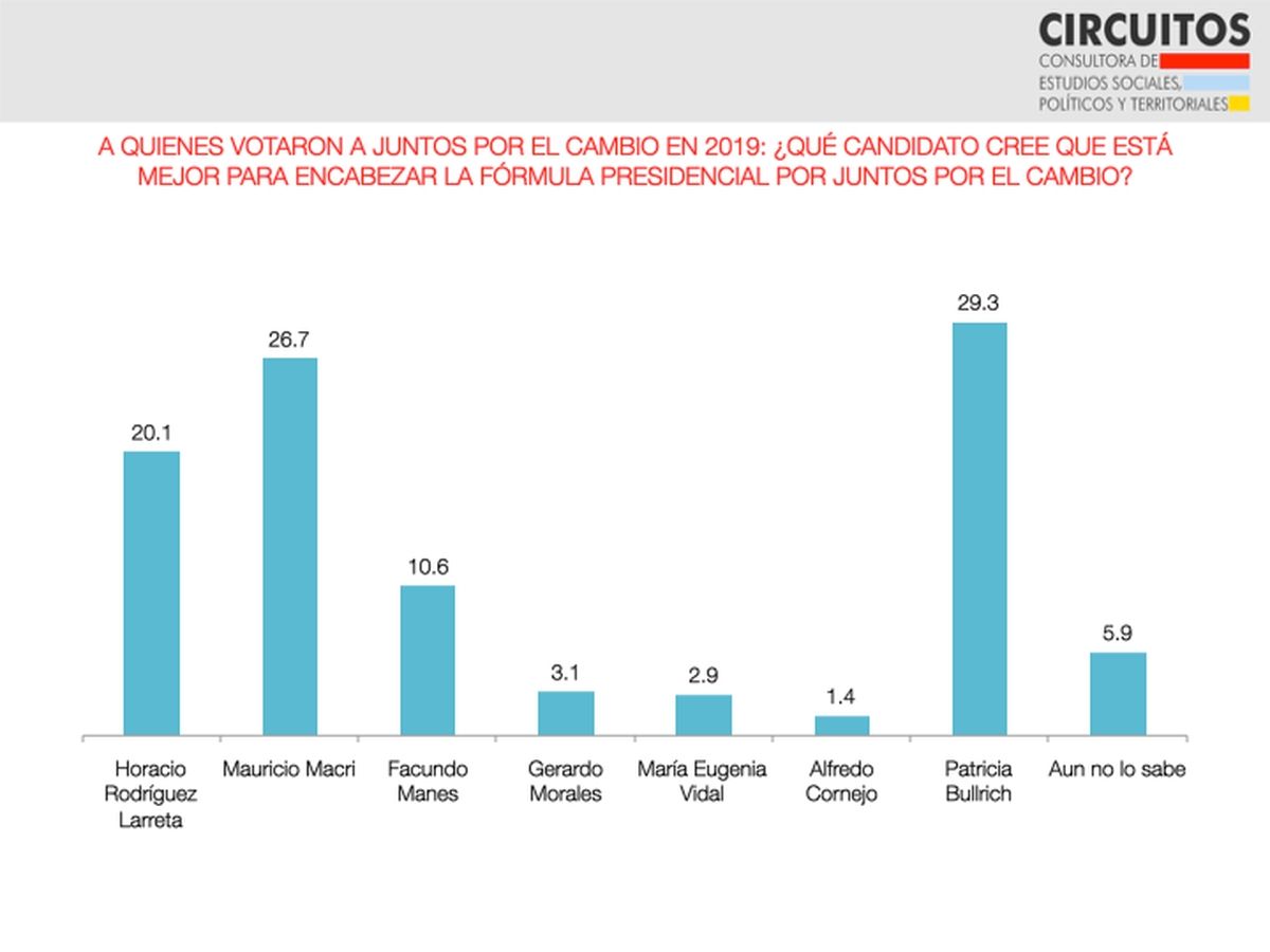 Es la primera encuesta donde la presidente del PRO supera en provincia de Buenos Aires a Mauricio Macri y a Horacio Rodríguez Larreta. El expresidente retrocede 0,8% y se ubicó en el 26,7% de las preferencias durante septiembre. Teniendo en cuenta el margen de error del estudio (+/- 3,5) se trata casi de un empate técnico con Patricia Bullrich.