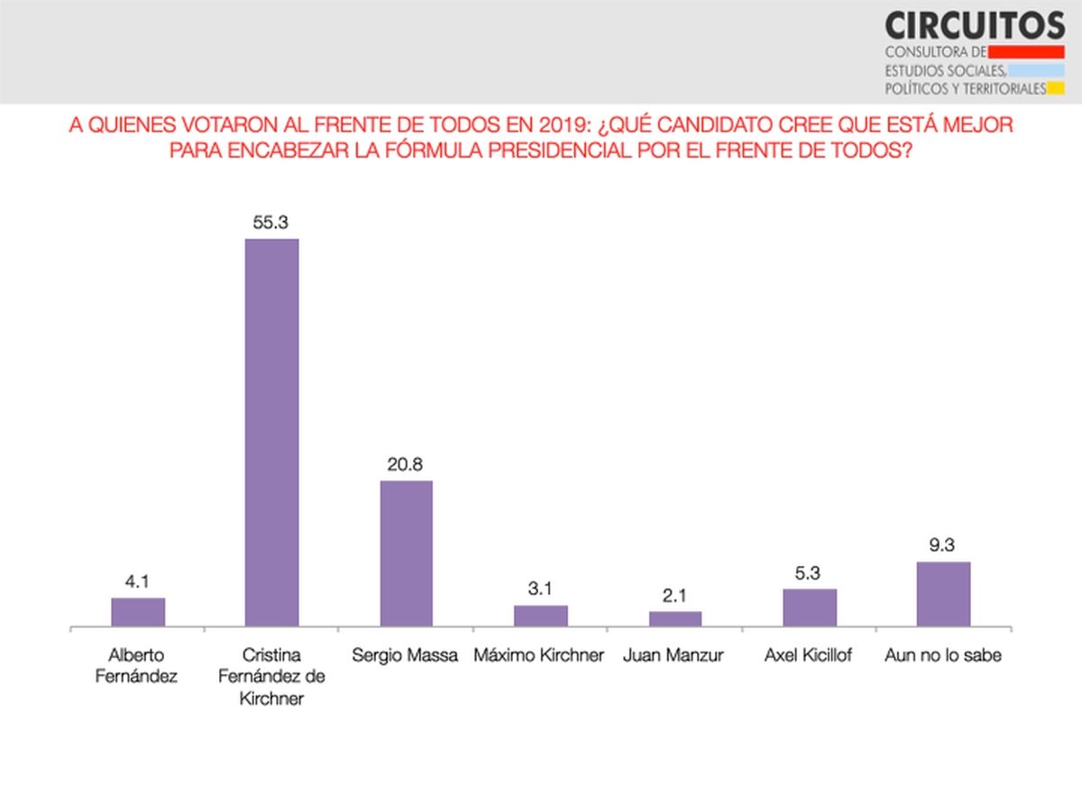 En el Frente de Todos, dentro de su propio electorado, los liderazgos se mantuvieron estables con respecto a agosto. La encuesta de Circuitos muestra que Cristina Fernández de Kirchner se mantiene en torno al 55% de agosto. Por su parte, Sergio Massa sufrió un leve retroceso respecto a la medición anterior, del 22,6% de agosto al 20,8% de septiembre, aunque por el margen de error de la encuesta, estadísticamente el recorte no es significativo.