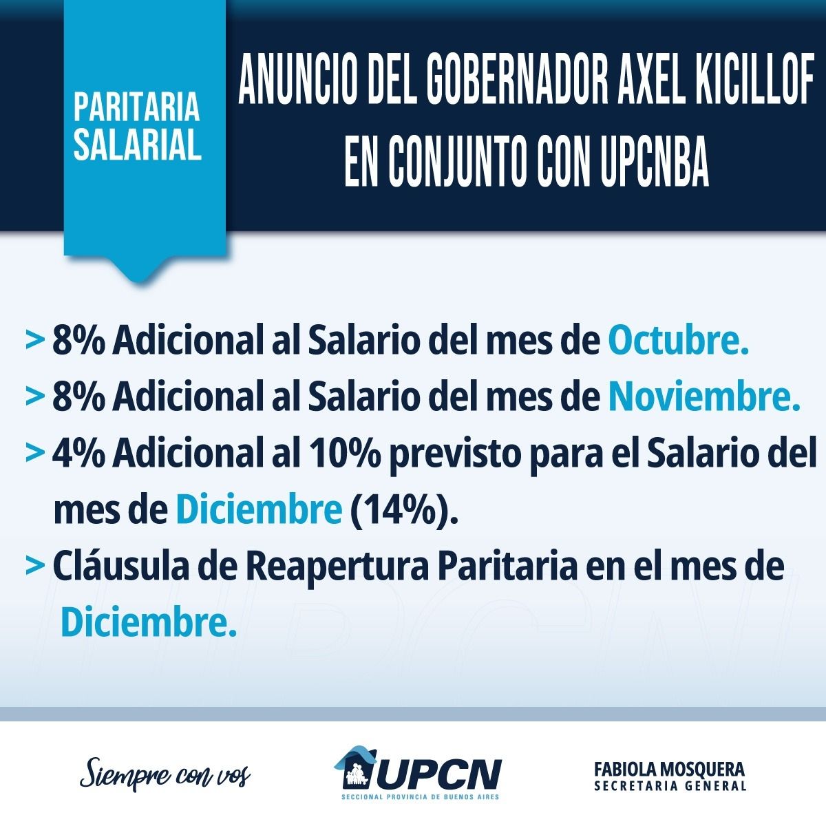 El gobernador, como si estuviera en un acto, anuncio dos aumentos del 8% para los meses de octubre y noviembre y un 4% adicional al 10 % previsto para el mes de diciembre, con lo que el sueldo de los estatales bonaerense terminaría el año con un 90% de aumento, con el compromiso de sentarse en diciembre para rediscutir paritarias.