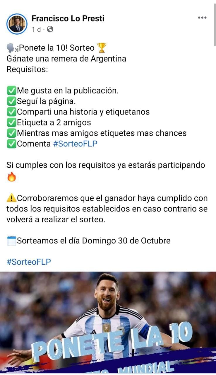 La publicación dice: “Ponete la 10. Gánate una remera de Argentina”. Como requisitos, indica “poner me gusta en la publicación, seguir la página, compartir la historia, etiquetar a dos amigos", y aclara que “mientras más amigos etiquetes, más chances tendrás de ganar”. Además, subraya que sólo participarán quienes hayan “cumplido los requisitos”. El sorteo será el domingo próximo.