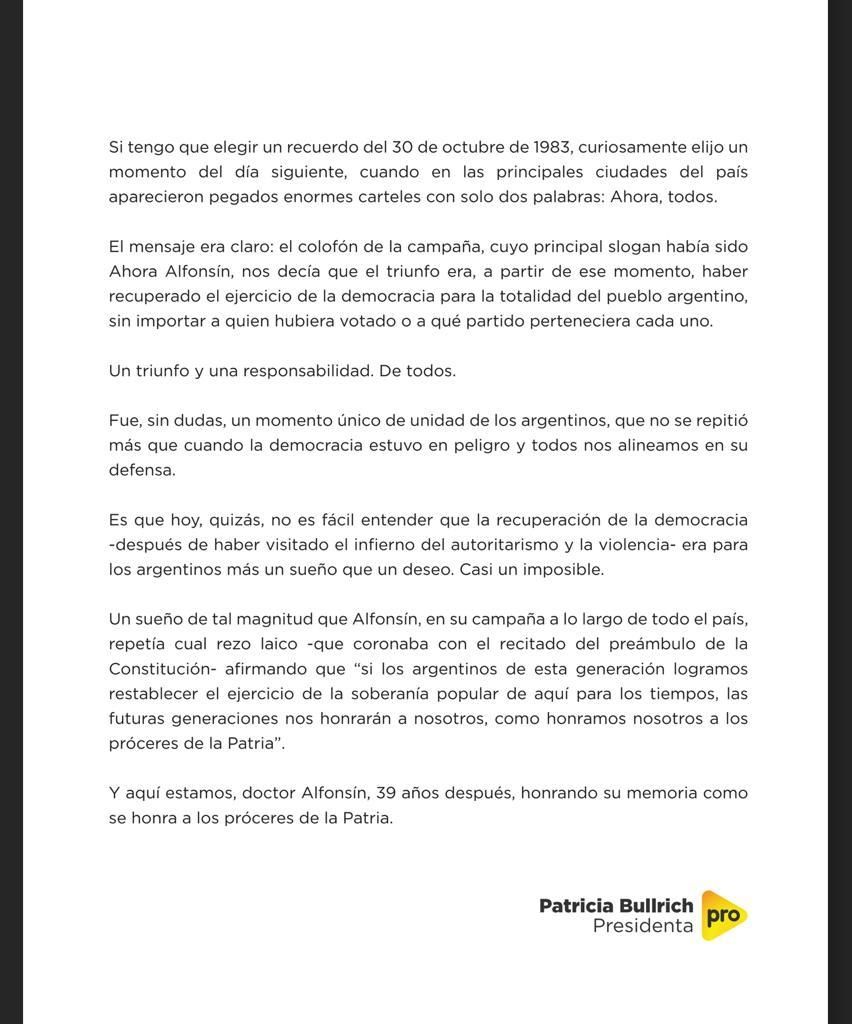 "El mensaje era claro. El colofón de la campaña cuyo slogan fue Ahora Alfonsín y luego del triunfo nos decía que la democracia era responsabilidad de todos, sin importar a quién hubiéramos votado o a qué partido pertenecía cada uno... Fue, sin dudas, un momento histórico y único en nuestra historia, que no se repitió más que cuando la democracia que habíamos ganado estaba en peligro y todos nos alineábamos en su defensa", dijo en su corta pero precisa carta que leyeron en el acto radical.