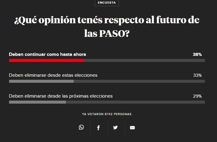 Un 29,15% de quienes opinaron dijeron que hay que suprimir esa instancia electoral, pero no desde el 2023 sino en las elecciones siguientes. Un 33,3% cree que hay que sacarlas desde ahora y que, en consecuencia, el año que viene se vote sin primarias como propone un sector del oficialismo nacional. El 37,5%, en cambio, defiende esa elección y opina que hay que mantener el sistema como está hoy. En total votaron 6814 personas.