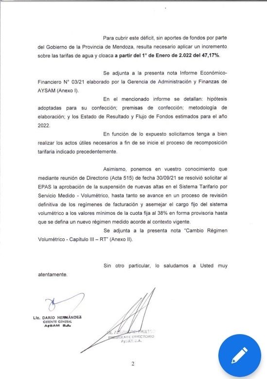 Mediante reunión de Directorio de AySam (Acta 515) de fecha 30/09/21 se resolvió solicitar al EPAS la aprobación de la suspensión de nuevas altas en el Sistema Tarifario por Servicio Medido - Volumétrico, y asemejar el cargo fijo del sistema volumétrico a los valores mínimos de la cuota fija. "La intención es eliminar el régimen tarifario del servicio medido para evitar que el usuario pueda gastar menos y para mejorar la facturación de los dos restantes"