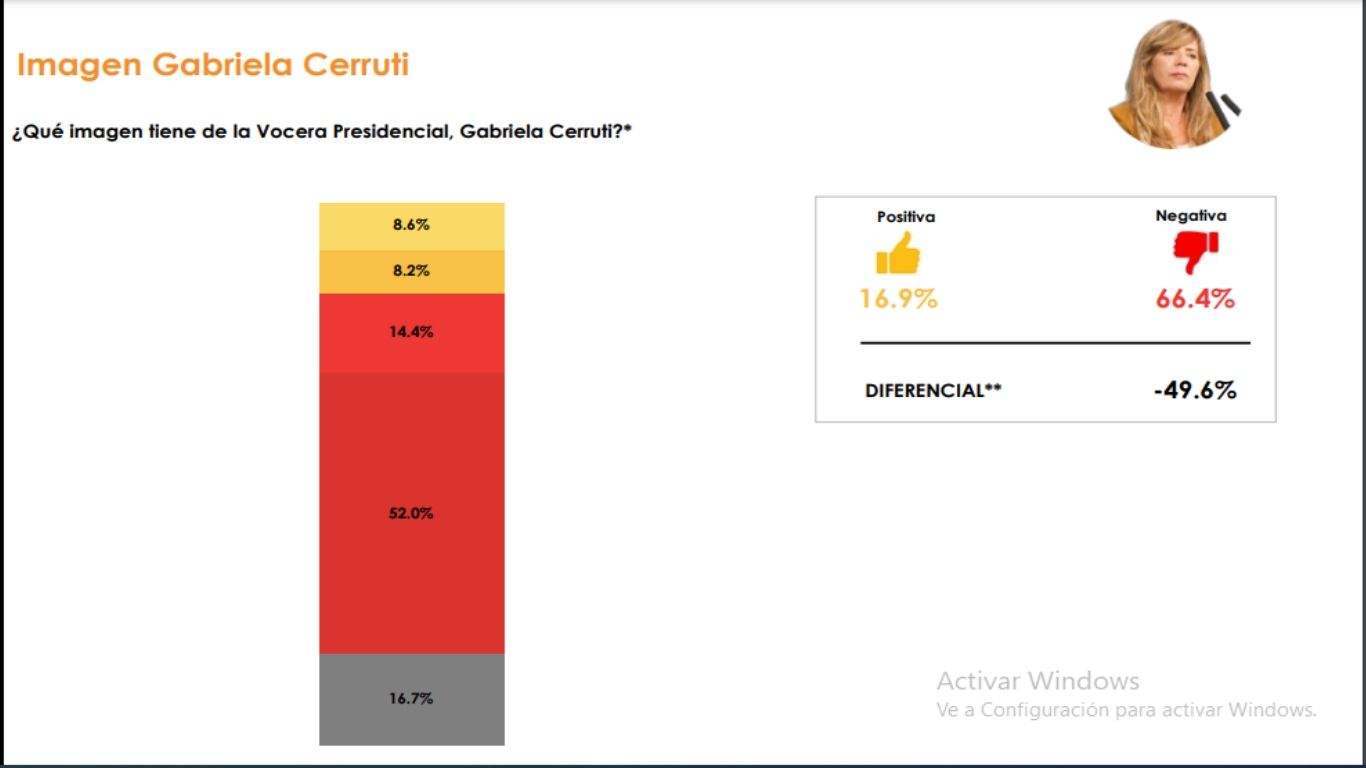 Pero la encuesta es aún más demoledora con la funcionaria del kirchnerismo teniendo en cuenta que el 65,3% de los consultados considera que Gabriela Cerruti debe renunciar a su cargo.