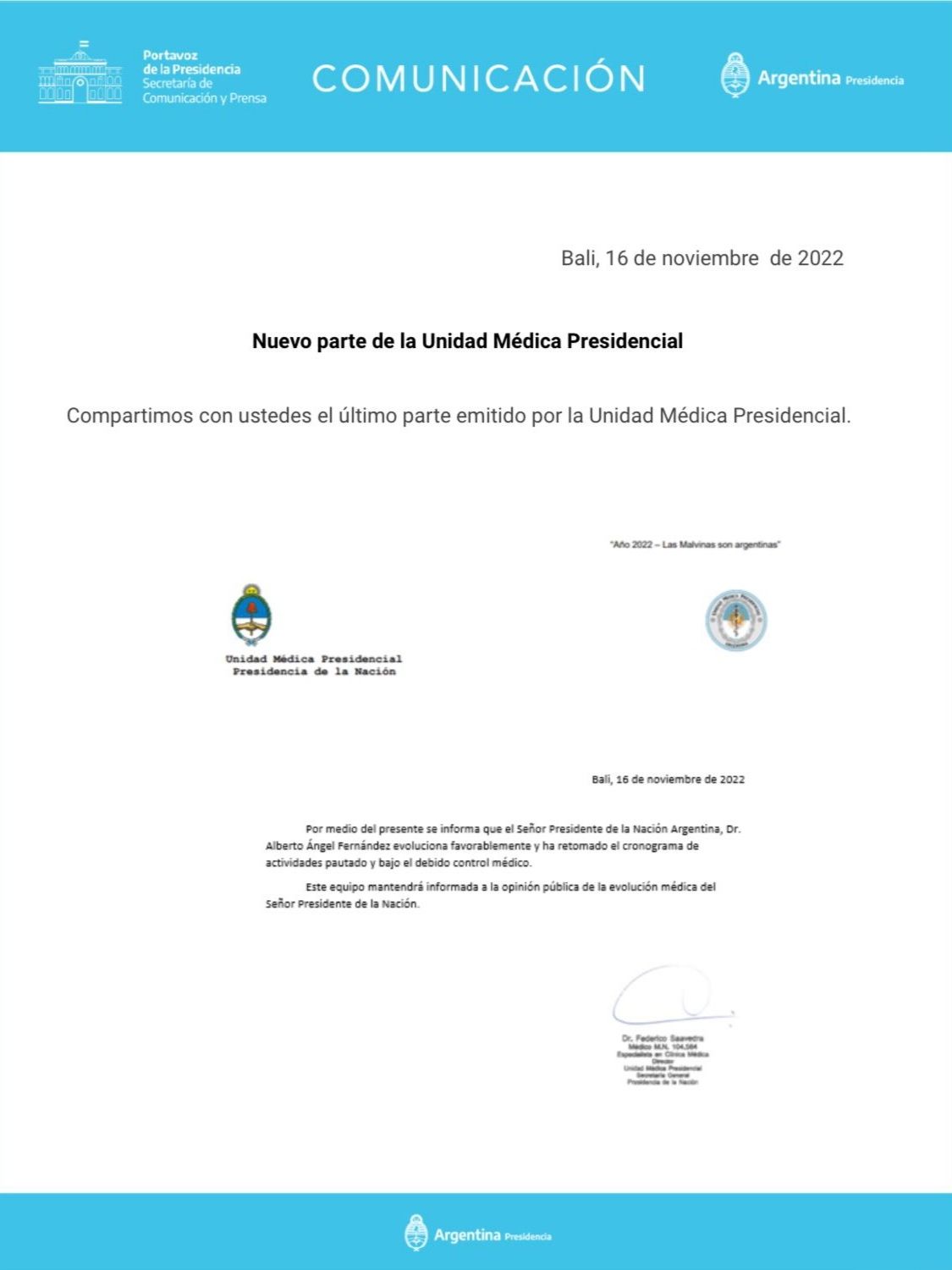 En cuanto a la salud del presidente, Gabriela Cerruti, portavoz del Gobierno, aseguró que "descansó y amaneció bien. Su médico lo controla. Preocupado como todos acá por lo que pasó en Polonia. Habló con Santiago (Cafiero) y Sergio (Massa) de los temas del día antes de que salieran a las actividades. Después del ayuno de ayer, desayunó liviano según la prescripción médica".