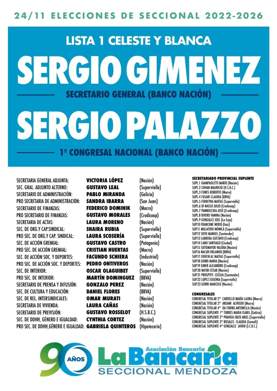 Giménez encabeza la lista que a nivel nacional representa otro mendocino, su tocayo, el diputado nacional por el Frente de Todos Sergio Omar Palazzo. Se trata de la Celeste y Blanca. “Es una lista única conformada con representantes de los distintos bancos de la provincia. Además, nosotros tenemos la exigencia del 30% del cupo femenino, pero estamos en el 40% de mujeres en lugares importantes”, sostuvo Gimenez en diálogo con MDZ. El bancario representa al Banco Nación pero el listado tiene integrantes de todos los bancos que operan en la seccional “y también tenemos representación geográfica, con compañeros del Este y del Valle de Uco”, agregó. El Sur, compuesto por Alvear, San Rafael y Malargüe es otra jurisdicción que dirige Martín Bueno, quien va por la reelección.