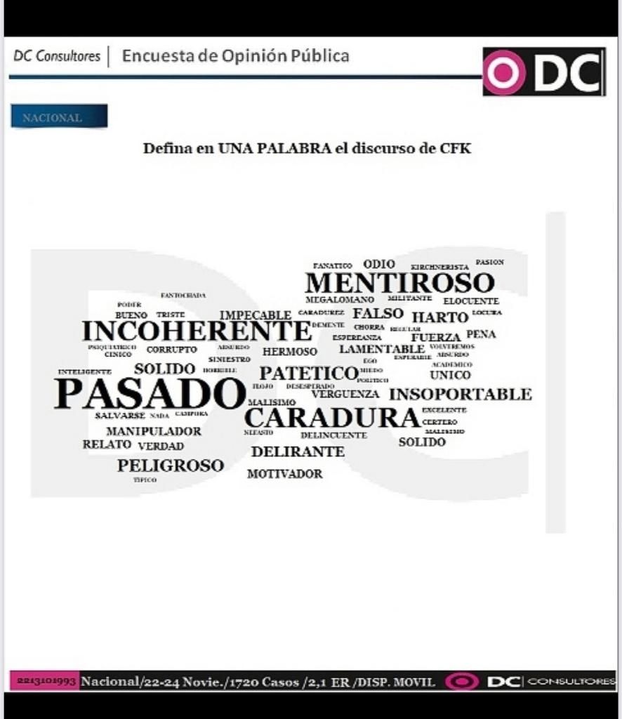 “Para la gente, ósea gran parte del país, que no compra el relato kirchnerista, Cristina es el pasado. Y eso es lo que se ve en el juego de palabras. Mentiroso fue la segunda palabra más usada para definir el discurso de la vicepresidente, seguido de palabras más duras como incoherente y caradura”, sentenció el titular de DC Consultores.
