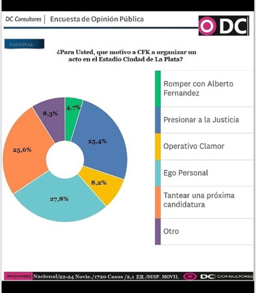 “Queríamos ver qué impacto tuvo en la sociedad esta convocatoria militante, buscamos algunas opciones como para tener alguna cercanía a la sensación. El 27% de los encuestados respondió que el acto fue por ego, el 25,6 % que fue un tanteo a sus aspiraciones presidenciales y el 25,4% que fue para marcarle la cancha a la Justicia por sus causas judiciales"
