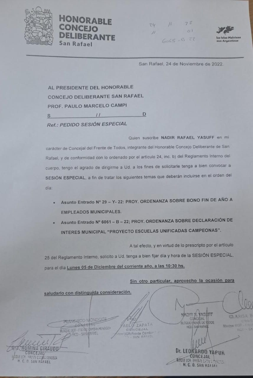 La interna del peronismo en San Rafael generó una inédita sesión del Concejo Deliberante ayer sábado a las 15, una hora antes del partido del Mundial de fútbol en el que la Selección de Argentina le ganó a México por 2 a 0. El concejal de La Cámpora Nadir Yasuff , impulsó un bono de fin de año por 50.000 pesos para los empleados municipales y eso generó malestar en el oficialismo al que pertenece ya que el intendente Emir Félix (Frente de Todos) se encuentra en paritarias con los municipales. Como parte de la disputa, la presidencia del Concejo dispuso una sesión 60 minutos antes del esperado partido y la iniciativa de Yasuff fue rechazada por 10 votos contra 2.