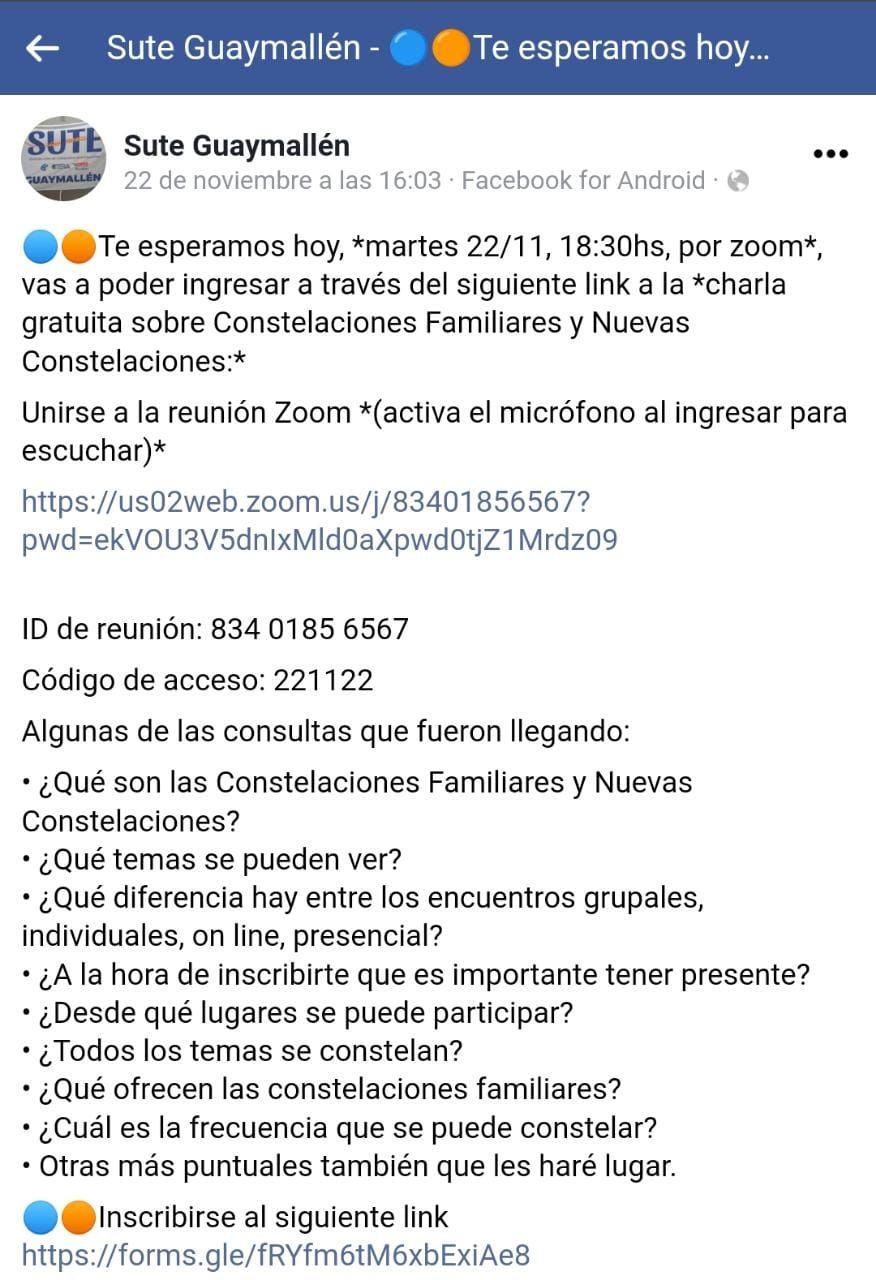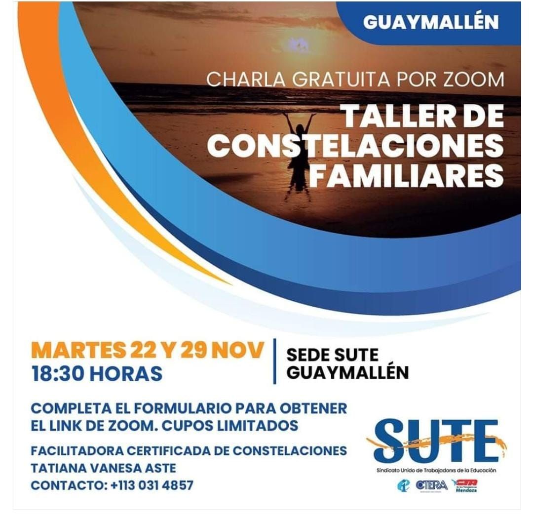 “Charla gratuita por zoom Taller de Constelaciones Familiares”, anuncia el flyer que está en el Facebook de la sede Guaymallén del sindicato. ¿Qué son las constelaciones familiares?¿Qué temas se pueden ver? ¿Qué diferencias hay entre los encuentros grupales, on line, presencial?¿Qué son las constelaciones familiares y nuevas constelaciones? ¿Todos los temas se constelan? ¿Desde qué lugar se puede participar? Estas son las preguntas disparadoras del taller que ya lleva su primera clase y está dictado por una persona certificada en constelaciones.