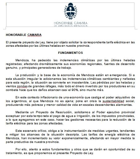 El mismo propone: "Solicitamos al Poder ejecutivo provincial exceptuar por esta temporada el pago de agua a Irrigación, de los impuestos provinciales, a lo que agregamos en este caso, hacer las gestiones necesarias para la reducción de la tarifa eléctrica para las zonas afectadas. Redúzcase la tarifa de energía eléctrica al 40%, con tratamiento similar a la tarifa Social, para todo el sector de nuestra provincia declarado en Emergencia por el Poder Ejecutivo Provincial" bajo la fundamentación de que "en este contexto inflacionario de una economía que castiga el poder adquisitivo de los argentinos, al que Mendoza no es ajena; pone en crisis la sustentabilidad social, produciendo más pobreza y menor calidad de vida en escalas descendentes alarmantes.