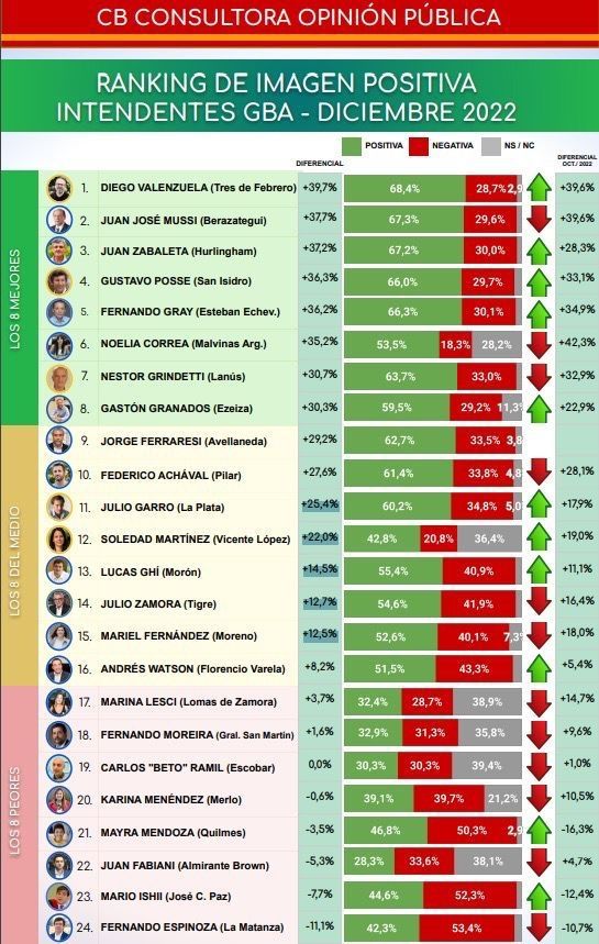 Pensando ya en las elecciones generales del 2023, el jefe comunal obtuvo una imagen positiva del 68,4% y un porcentaje negativo del 29%. En el ranking lo acompañan Juan José Mussi (Frente de Todos) de Berazategui, con 67,3%; y Juan Zabaleta (Frente de Todos), de Hurlingham, con 67,2%. “Voy a seguir trabajando todos los días por un Tres de Febrero mejor para cada uno de los vecinos y vecinas, quiero que esta transformación que llevamos adelante se pueda replicar en la provincia”, destacó el mandatario del oeste.