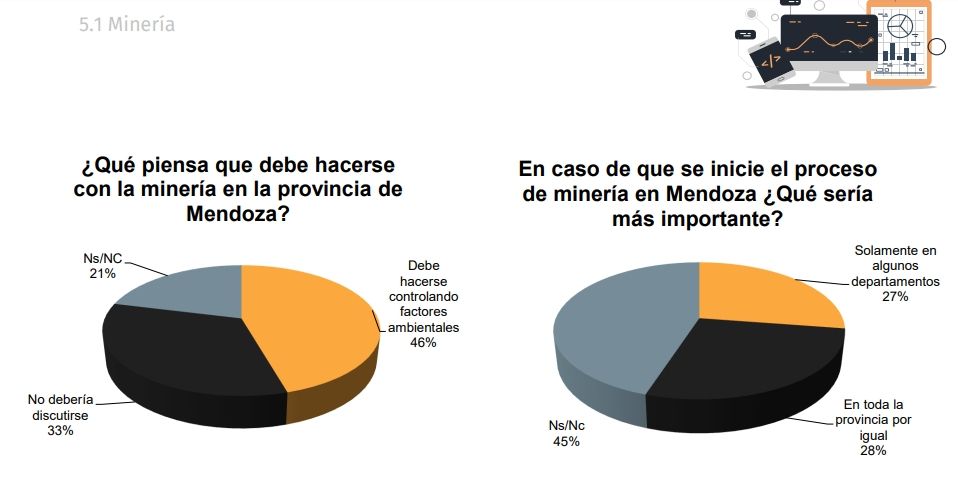 "¿Qué piensa que debe hacerse con la minería en la provincia de Mendoza?", fue la consulta de OPM y el 46% dijo que la minería "debe hacerse controlando factores ambientales". Mientras tanto el 33% dijo que no debería discutirse y un 21% prefirió no contestar.
