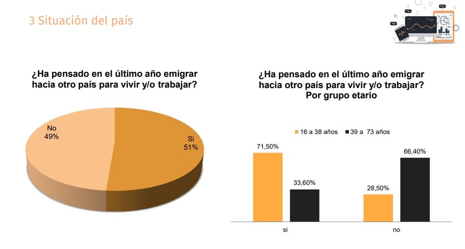 El dato más contundente es que el 51% de los encuestados dijo que ha pensado en irse a vivir a otro país. En el rango etario de 16 a 38 años, el 71,5% dijo que armaría las valijas.