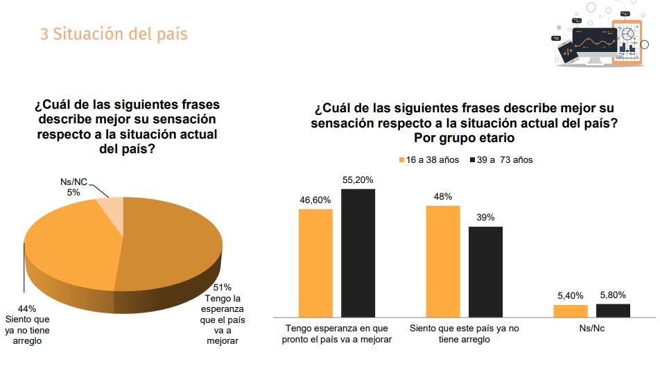 Justamente, es en ese rango etario donde se evidencia menos optimismo de cara al futuro. El 55,2% de las personas mayores a 39 años considera que hay esperanza de que el país va a mejorar, pero en los menores de 39 años solamente el 46% tiene ese sentimiento.