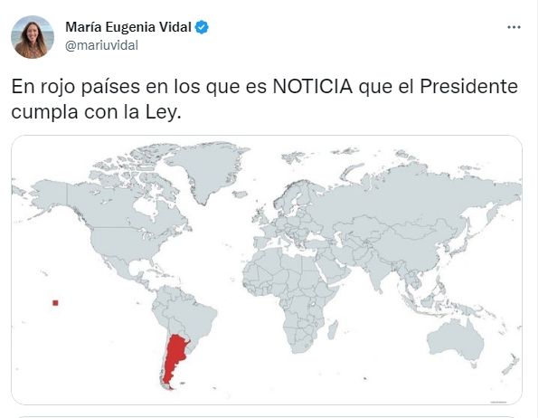 Luego del anuncio del Gobierno, Vidal se manifestó de forma irónica. "En rojo países en los que es noticia que el Presidente cumpla con la Ley", sostuvo junto a una imagen de un planisferio donde solo la Argentina figura coloreada.
