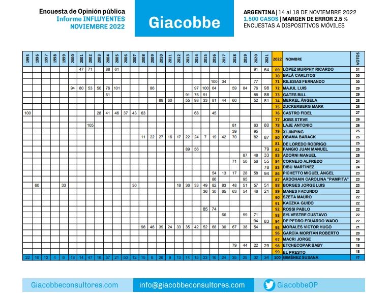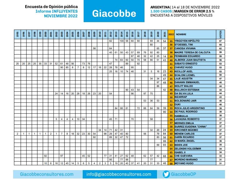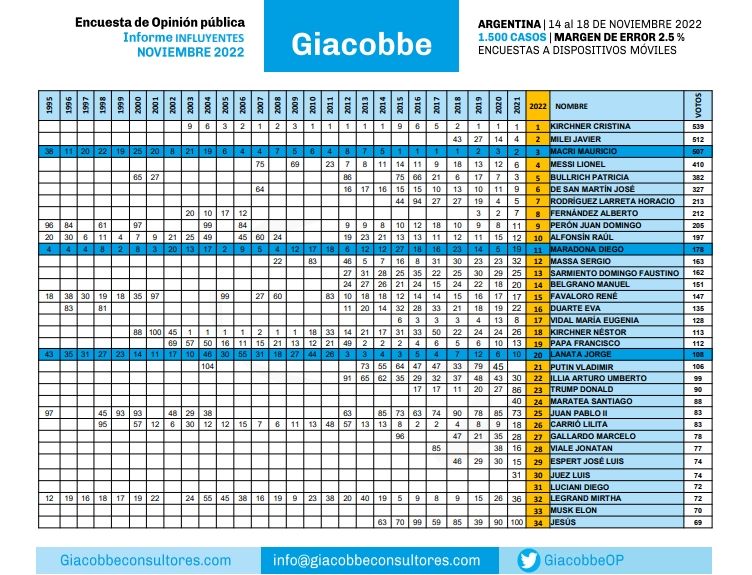 El sondeo tiene en su top 3 a la vicepresidenta de la Nación, Cristina Fernández de Kirchner; el diputado nacional de La Libertad Avanza, Javier Milei, y al capitán de la Selección argentina Lionel Messi. La encuesta constó de 1.500 casos tomados entre el 14 y 18 de noviembre, con un margen de error de 2,5%.